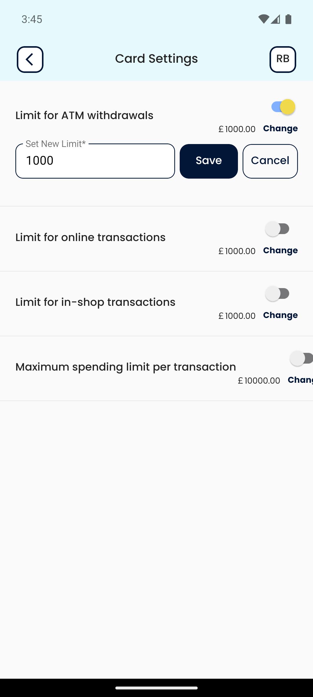 - Management of ATM withdrawal limits, online transaction limits, in-shop transaction limits, and maximum spending limits per transaction.